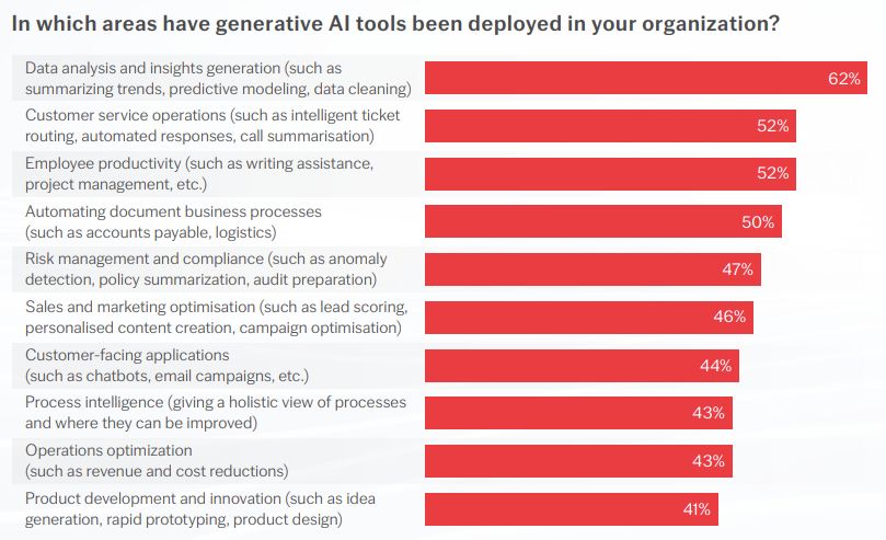 Interessant sind aber auch einige weitere Erkenntnisse der Studie: Demnach nutzen 65 Prozent der Finanzdienstleister zweckgebundene KI (global: 59 Prozent), während 62 Prozent agentische KI einsetzen (Branchendurchschnitt: 53 Prozent). Wichtige Einsatzfelder sind Datenanalyse (59 Prozent), Mitarbeitereffizienz (56 Prozent), Automatisierung von Geschäftsdokumenten (56 Prozent) sowie kundenorientierte Anwendungen wie Chatbots (55 Prozent). Zu den Bereichen, in denen GenAI besonders häufig genutzt wird, zählen Finanzen (57 Prozent), Vertrieb und Marketing (56 Prozent) sowie Compliance und Rechtsabteilungen (45 Prozent). Verbesserungswünsche betreffen vor allem eine Reduzierung des Ressourcenverbrauchs sowie Maßnahmen gegen menschliche Voreingenommenheit in den Ergebnissen.