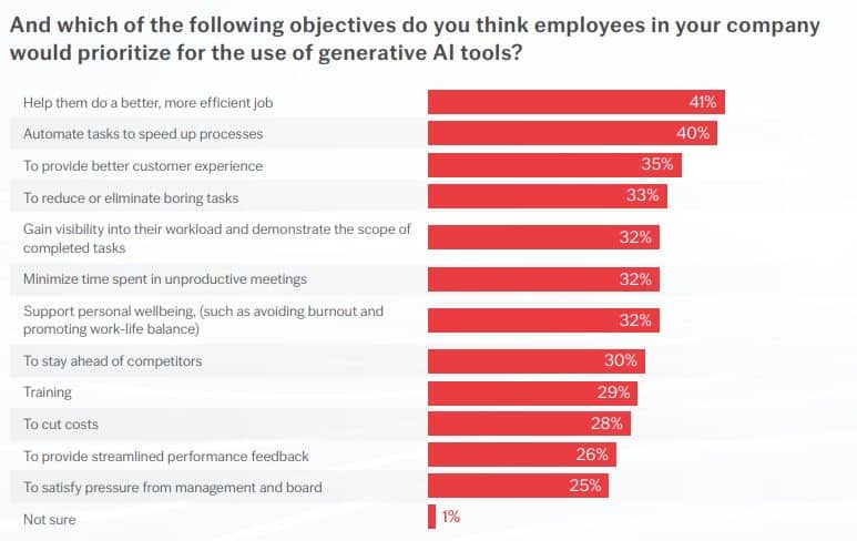 Die Untersuchung zeigt zudem, dass vielfach Mitarbeitende selbst den Anstoß zur Einführung von Generativer KI gaben. 40 Prozent der Führungskräfte berichten von Fällen, in denen Beschäftigte GenAI über „Bring Your Own Software“ am Arbeitsplatz nutzten, etwa zur Steigerung der persönlichen Produktivität. Dies wirft laut Studie Fragen hinsichtlich IT-Sicherheit und Compliance auf. Über die Hälfte (51 Prozent) gehen davon aus, dass Mitarbeitende GenAI nutzen, um professioneller oder effizienter zu wirken; 67 Prozent sehen den Einsatz als Mittel zur Reduzierung der eigenen Arbeitslast. Insgesamt wird Generative KI laut den befragten Führungskräften überwiegend positiv aufgenommen: 88 Prozent bewerten die Haltung ihrer Mitarbeitenden als offen und optimistisch.
