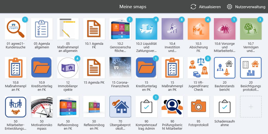 Der erste Anwendungsfall war die Entwicklung eines digitalen Beratungstools für das Firmenkundengeschäft. Das Ziel bestand darin, den Beratern alle besuchsrelevanten Kundendaten sowie einen strukturierten Fragenkatalog via Notebook und Tablet digital bereitzustellen. Zudem sollte die ehemals papierbasierte Dokumentation der Gespräche digitalisiert werden. Mit smapOne konnte die benötigte App binnen kurzer Zeit erstellt werden. Die benötigten Kundendaten ruft das Beratungstool mithilfe einer API-Anbindung aus agree21 ab. Eine weitere Schnittstelle übergibt die entstandenen Berichte direkt an die Cloudanwendung agree21Doksharing. Das Beratungsprotokoll wird Kunden sofort und automatisch per E-Mail zugeschickt.