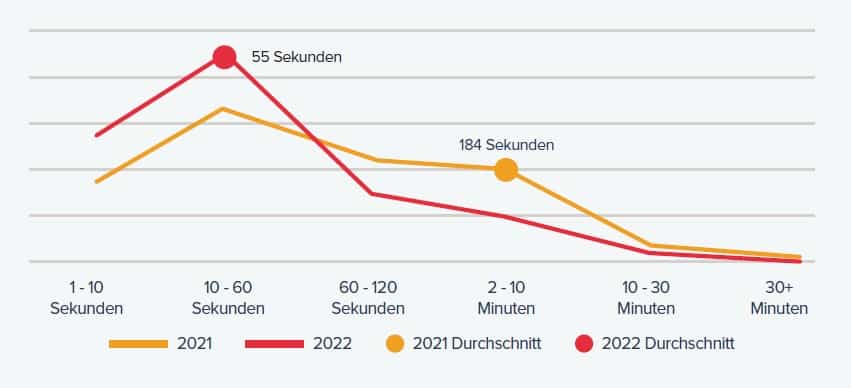 Erstmals wurde bei den im Link11-Netzwerk registrierten DDoS-Attacken analysiert, wie viele Sekunden nach der Übertragung der ersten Bytes vergehen müssen, bis der Traffic seinen Maximalwert erreicht. Im ersten Halbjahr 2022 wurde eine kritische Nutzlast im Durchschnitt bereits 55 Sekunden nach Einsetzen der DDoS-Attacke erreicht. Im Vergleich dazu erzielten die Angriffe im Jahr 2021 erst nach durchschnittlich 184 Sekunden ihren Höhepunkt.
