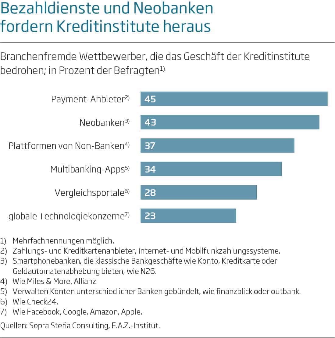 Klassische Kreditinstitute sehen ihr Geschäft aktuell vor allem durch Payment-Anbieter bedroht. 45 Prozent der befragten Entscheider zählen ebenjene Zahlungs- und Kreditkartenunternehmen und Internet- sowie Mobilfunkzahlsysteme derzeit zu ihren stärksten Wettbewerbern. Aufgrund der Fokussierung der Payment-Provider auf mobile Endgeräte besetzen diese eine wichtige Kundenschnittstelle, die insbesondere viele Banken zu lange stiefmütterlich behandelt hatten. Wirecard launchte beispielsweise erst kürzlich eine Art eigene Neobank (das wichtigste B2C-Produkt Boon Planet) und im Oktober eine volldigitale Multi-Merchant-Loyalty-Lösung für Händler, die Loyalitätsprogramme und Zahlungsdienste vereint.