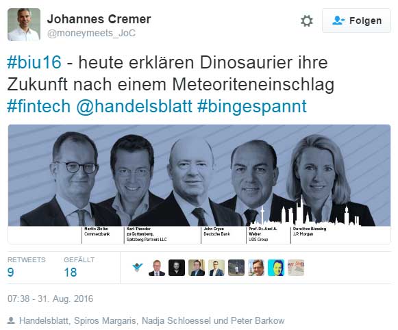 Während ein FinTech Entrepreneur im Vorfeld auf Twitter schon von den “Dinosauriern” sprach, die auf dem Kongress ihre Zukunft nach dem Meteoriteneinschlag erklärten, musste man sich bei den Keynotes durchaus wundern. Die Aussagen und vor allem die verwendeten Buzz-Words der Vorstandsvorsitzenden der größten Banken hätten auch 1:1 von den Pitches jungen StartUp-Gründern kommen können.