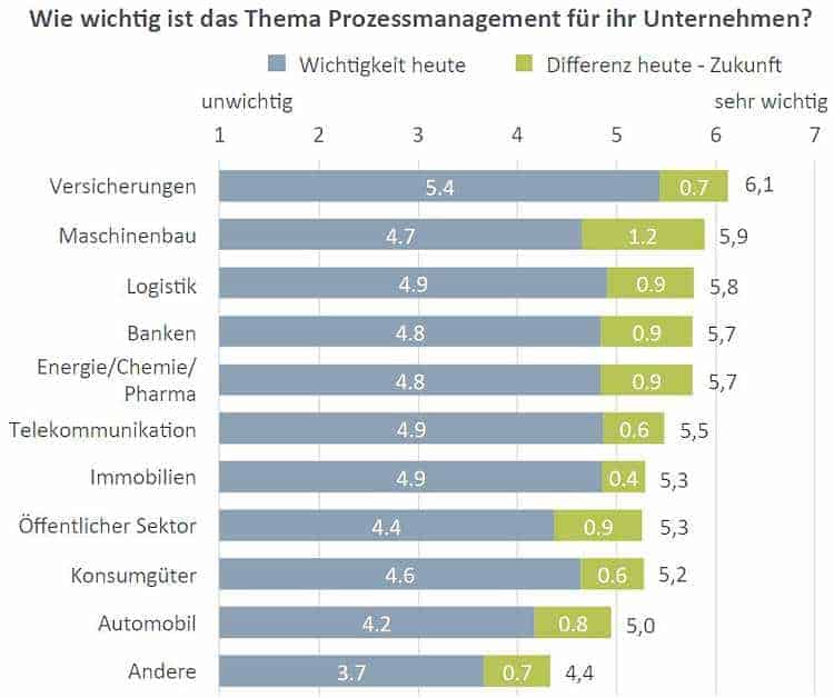 Befragt wurden knapp 300 Unternehmen aus Deutschland, Österreich und der Schweiz. Die zentralen Ergebnisse: Für drei Viertel der Befragten ist Prozessmanagement schon heute ein wichtiges oder sehr wichtiges Thema. Der Schwerpunkt liegt aber nicht nur auf der Senkung von Kosten. Es ginge vielmehr darum, alle Prozesse konsequent auf den Kunden auszurichten und ein besseres Verständnis der Anforderungen an das eigene Geschäftsmodell zu ermöglichen.