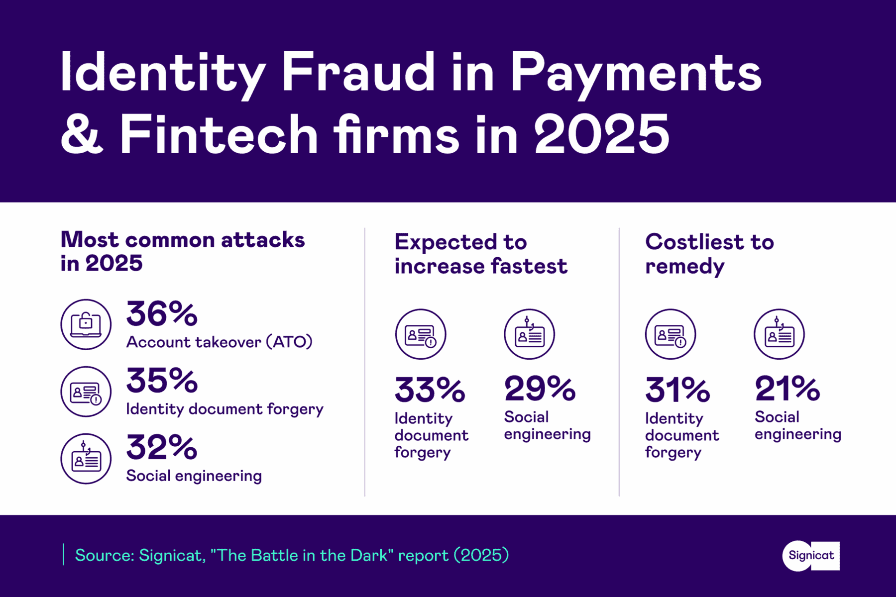 Die Studie beschreibt detailliert, welche Angriffsmuster im Jahr 2025 dominieren. Am weitesten verbreitet ist die Kontoübernahme, von der 36 Prozent der identitätsbezogenen Angriffe betroffen sind. Unmittelbar danach folgen professionell gefälschte Ausweisdokumente, die 35 Prozent der Fälle ausmachen, sowie Social-Engineering-Angriffe, die zu 32 Prozent beobachtet werden. Bei der voraussichtlichen Zunahme der Angriffe stehen Dokumentenfälschungen mit 33 Prozent an erster Stelle und Social Engineering mit 29 Prozent an zweiter. Auch in den Kostenstrukturen bilden diese beiden Kategorien den gravierendsten Schaden ab. Sowohl Dokumentenfälschungen als auch Social-Engineering-Angriffe verursachen jeweils 31 Prozent der höchsten Behebungskosten. Diese Entwicklung zeigt, dass die Komplexität identitätsbezogener Angriffe zunimmt und dass sich Betrug immer stärker in schwer skalierbare Kontrollbereiche verlagert.