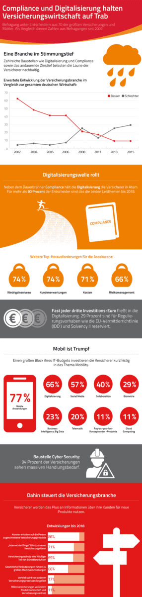 Von August bis September 2015 befragte das Marktforschungsunternehmen forsa im Auftrag von Sopra Steria Consulting Führungskräfte aus 70 der größten Versicherungs- und Maklergesellschaften Deutschlands zu ihrer gegenwärtigen Geschäftspolitik. Durch den Vergleich mit Ergebnissen früherer Branchenkompass-Studien seit 2002 zeichnet die aktuelle Untersuchung überdies zeitliche Veränderungen der Stimmungslage in der deutschen Versicherungswirtschaft nach.