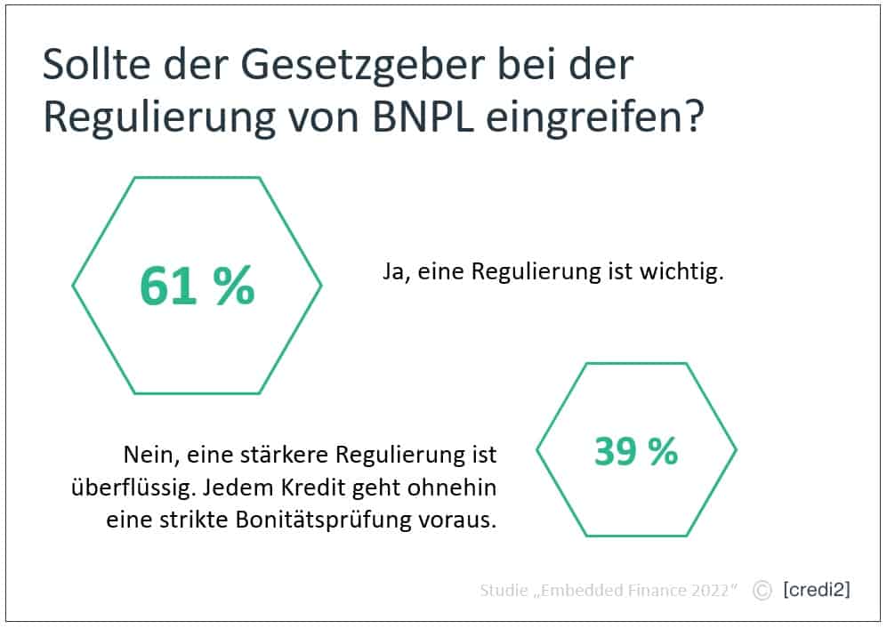 Deshalb plädiert die Mehrheit dafür, dass der Gesetzgeber eingreift und BNPL-Produkte für alle Anbieter verbindlich reguliert. Hintergrund dieser Forderung ist die Vermutung, dass einige BNPL-Player ohne Banklizenz ihre Kunden nicht ausreichend auf Kreditfähigkeit überprüfen. Ein von der Europäischen Kommission veröffentlichter Richtlinienvorschlag könnte bereits 2023 in geltendes deutsches Recht umgesetzt werden.