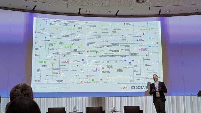 Mit diesem wichtigen Thema setzen sich Fabian Ittner (DZ BANK) und Stephan Paxmann (Landesbank Baden-Württemberg) auseinander und erklärten auf dem CIBI Innovationstag 2024 die jeweiligen Herangehensweisen ihres Hauses. Bei der DZ Bank beispielsweise erarbeitet man etwa 200 Mikrotrends, die dann in 20 Makrotrends konsolidiert werden, die dann wiederum einen klar definierten Prozess durchlaufen: Vom Trendsscouting und der Analyse zum Trend Lab, das acht Tage dauert und 20 Personen aus ganzer Gruppe mit einbezieht und unterschiedlichste Blickwinkel ermöglichen soll. Fabian Ittner erklärt dazu ganz selbstkritisch: