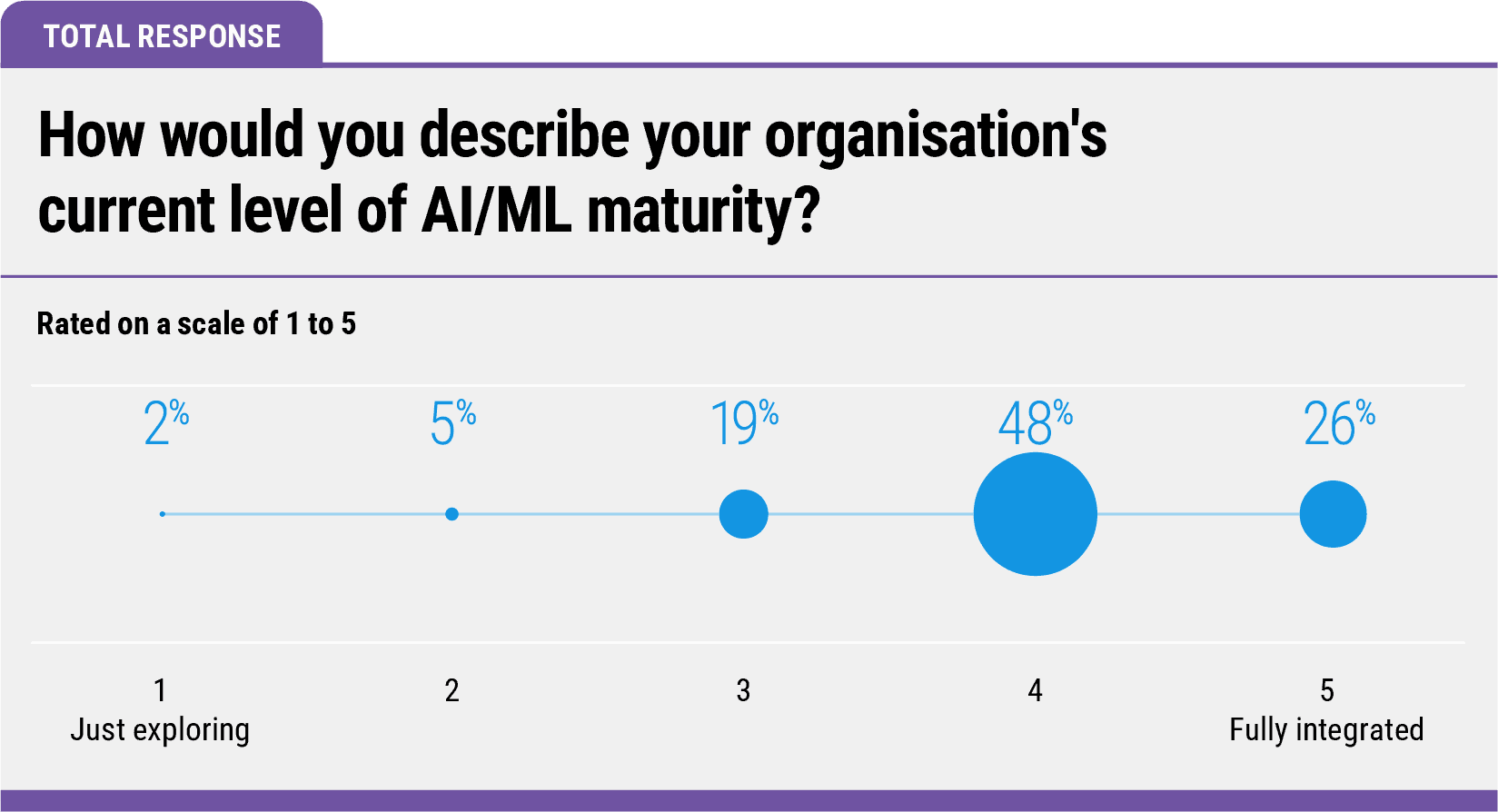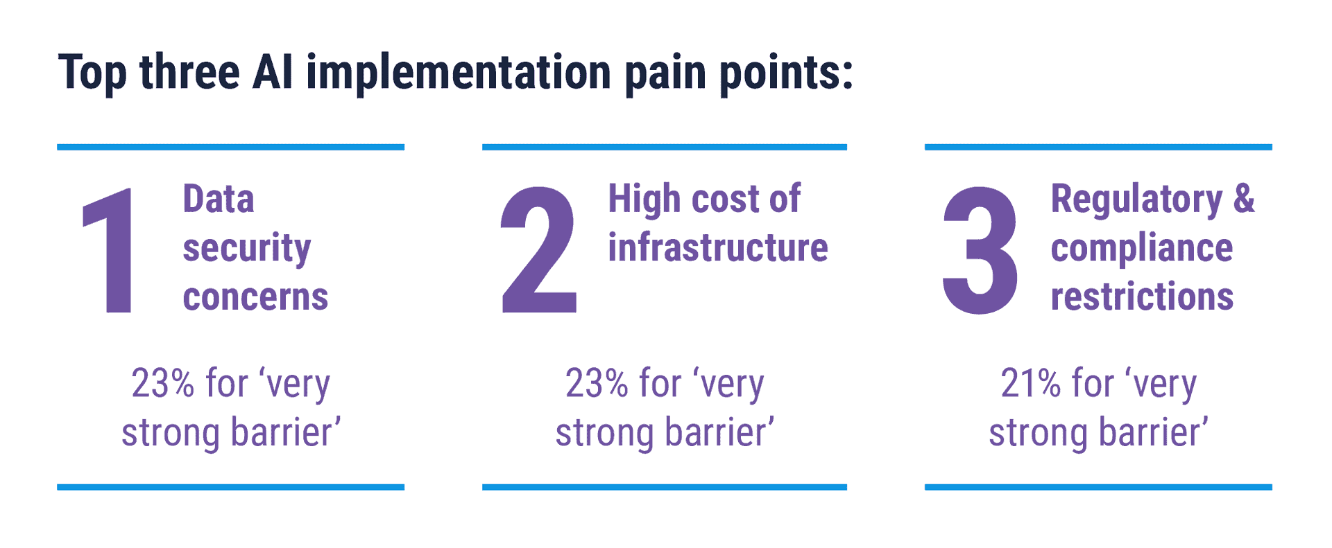 In der Studie geht Datensicherheit als das größte Hindernis für die Überwindung der Implementierungslücke bei KI hervor. Darüber hinaus berichten 97 Prozent der Finanzdienstleistungsunternehmen, Datensilos würden ihre Fähigkeit zum Aufbau und Einsatz effektiver KI-Modelle behindern.