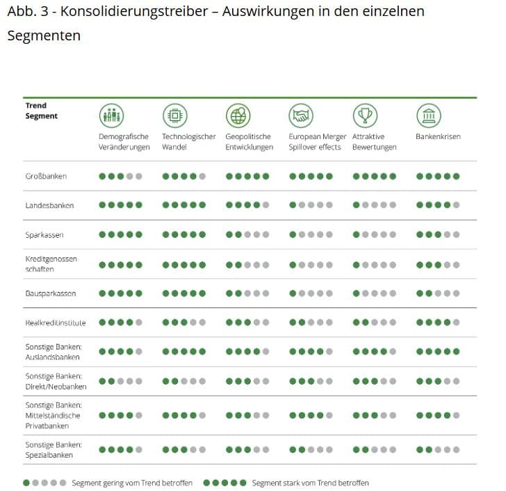 Die Auswirkungen des Strukturwandels fallen je nach Bankensegment unterschiedlich aus. Sparkassen und Genossenschaftsbanken stärken ihre Marktposition vor allem durch Fusionen und den Ausbau digitaler Fähigkeiten. Großbanken und Landesbanken verlieren dagegen Marktanteile und sehen sich gezwungen, ihre strategische Positionierung grundlegend zu überprüfen. Besonders hoch ist der Konsolidierungsdruck bei Bausparkassen und Realkreditinstituten. Neobanken und FinTechs nutzen gezielt M&A-Aktivitäten, um Skaleneffekte zu erzielen und regulatorische Anforderungen besser abzusichern. Ein zentrales Ergebnis der Studie ist die Neubewertung von M&A-Strategien.