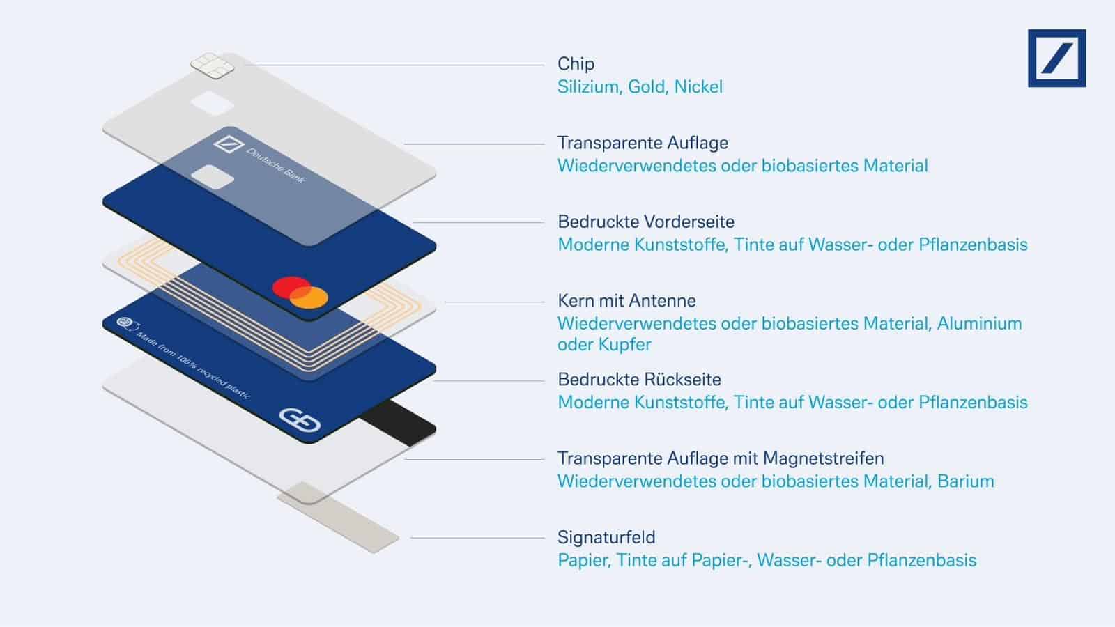 Die Deutsche Bank setzt in Zukunft beim gesamten Kartenangebot ausschließlich auf Zahlungskarten aus wiederverwertetem Kunststoff. Dafür wird die Produktion der Karten ab Mitte 2023 schrittweise auf recyceltes Material umgestellt. Zudem ermöglicht die Bank ihren Kundinnen und Kunden demnächst die Rückgabe von Karten, um diese wieder in die Kreislaufwirtschaft zurückzuführen.