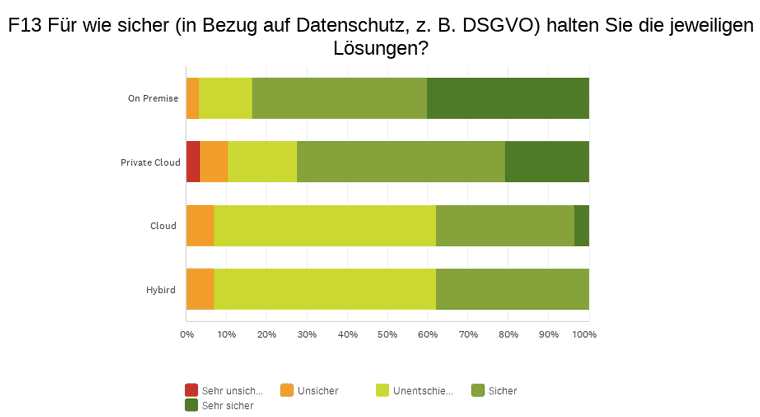Bei der Frage nach der Verfügbarkeit der jeweiligen Architektur sieht das Bild deutlich ausgeglichener aus. Besonders die Cloud kommt hier mit 69 %, die sie für sicher bis sehr sicher halten, besser davon. Mit 68,2 % büßt die On-Premise-Lösung hier ein wenig Vertrauen ein.