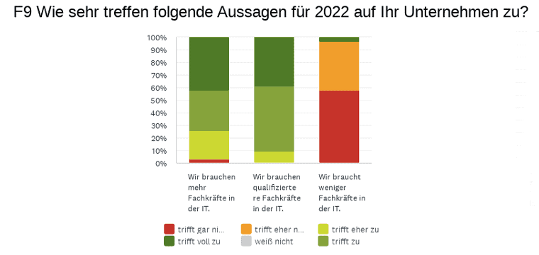 Folgerichtig betonen fast zwei Drittel (62,1 %) der Unternehmen, dass sie bereits für 2022 vorhaben, weitere IT-Fachleute einzustellen. Allerdings wird auch die Fluktuation steigen, denn ein knappes Viertel (24,2 %) sehen sich in den nächsten 5 Jahren nicht mehr beim selben Unternehmen. Die Zeit der lebenslangen Betriebszugehörigkeit scheint in der IT vorbei zu sein. Für die Unternehmen bedeutet das, dass sie alles daran setzen müssen, möglichst attraktive Arbeitsangebote zu schaffen, um sich auf dem Stellenmarkt durchzusetzen und gleichzeitig so attraktive Arbeitsbedingungen zu bieten, dass IT-Angestellte gehalten werden können.