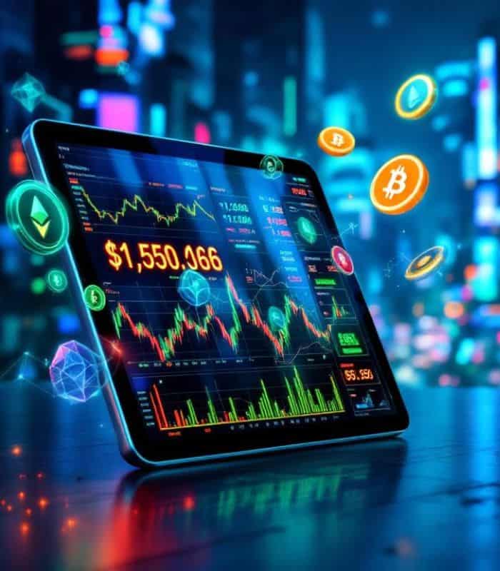Ein Tablet zeigt eine digitale Handelsoberfläche für Vermögenswerte, einschließlich Kryptowährungen wie Bitcoin und Ethereum. Die dargestellten Zahlen und Diagramme reflektieren aktuelle Marktbewegungen im Bereich der digitalen Vermögenswerte.