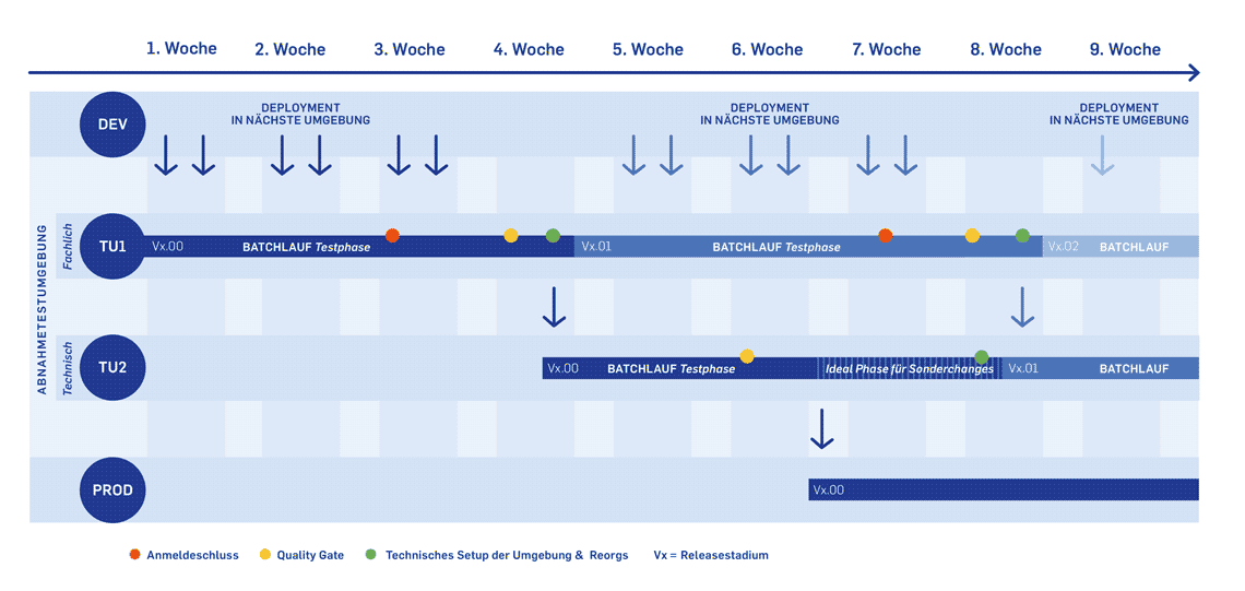 Das eigentliche Release wird am Wochenende eingeführt. Rein technische Themen können bereits im Vorfeld oder unmittelbar nach dem Release eingesetzt werden. Durch die gründliche Vorbereitung, die Entzerrung der Aufgaben und die effizienten Prozesse hat sich die Zeit für das Deployment nahezu halbiert und die Qualität der Softwareeinführungen deutlich verbessert.