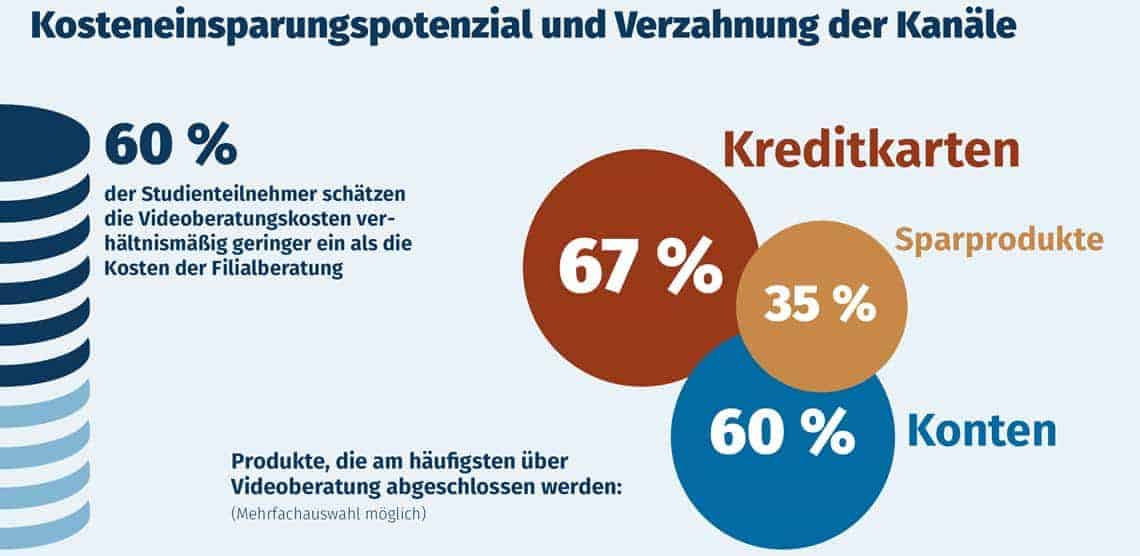 Die bereits angesprochene Verzahnung des Gesamtangebots der Video- und Filialberatung impliziert ein hohes Kosteneinsparungspotenzial. 60 % der Studienteilnehmer schätzen die laufenden Kosten einer Videoberatung verhältnismäßig geringer ein, als die Kosten der persönlichen Beratung in den Filialen. Auf dieser Grundlage können Institute durch eine sinnvoll geplante Verzahnung das Beratungsangebot ideal zwischen den Filialen und den digitalen Kanälen aufteilen, um so ihre Kostensituation zu optimieren. Nach Angabe der Institute eignen sich komplizierte Produkte wie zum Beispiel Baufinanzierungen, Depots oder Altersvorsorgen für eine Filialberatung, während der Abschluss von Kreditkarten, Konten oder Sparprodukten problemlos im Kanal der Videoberatung platziert werden kann.