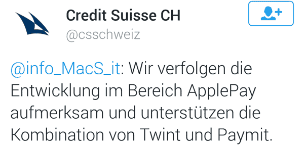 Während in Frankreich doch die allermeisten ordentlich gestellten Twitter-Anfragen beantwortet werden. Hält sich die UBS auf diesem Kanal ziemlich bedeckt und antwortet schriftlich. Auf die Anfrage, warum die Bank in den USA mitmacht aber in der Schweiz nicht, geht die Bank nicht ein. Die Crédit Suisse dagegen verweist in ihrer Standardantwort auf TWINT und Paymit.