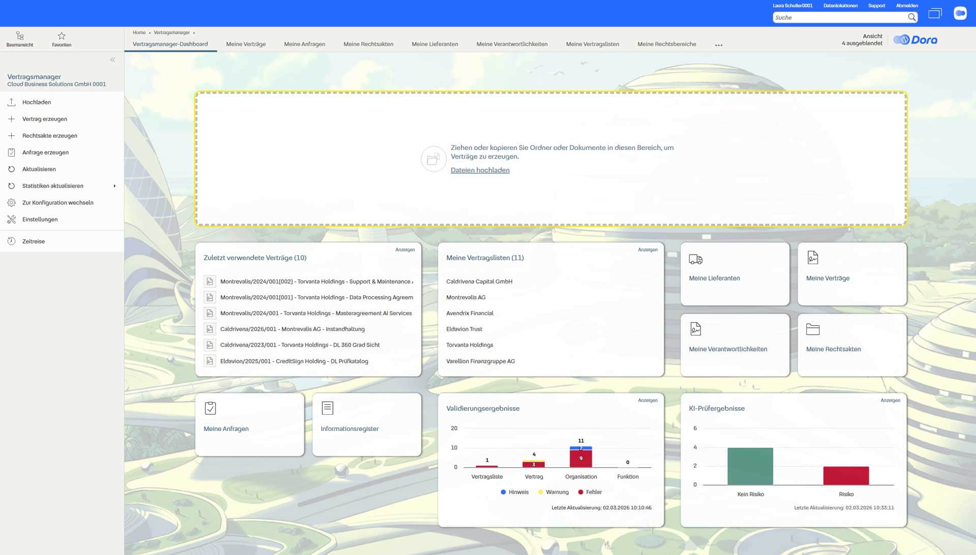 Das Dashboard von Fabasoft Dora präsentiert eine Übersicht über Vertragsmanagement-Funktionen. Es zeigt zuletzt verwendete Verträge, Warnungen und Validierungsergebnisse sowie Optionen zur Dokumentenverwaltung und -erstellung. Die Benutzeroberfläche ist klar strukturiert und benutzerfreundlich.