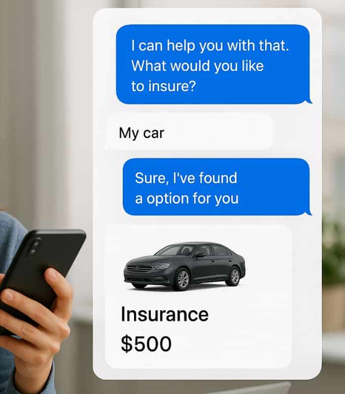 Eine Person interagiert über ein Smartphone mit einem KI-gestützten Chatbot, der Unterstützung bei der Versicherung eines Fahrzeugs anbietet. Diese Anwendung verdeutlicht die Prinzipien des Agentic Commerce durch personalisierte und automatisierte Kundenkommunikation.