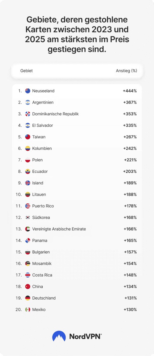 Die Analyse zeigt, dass die Preise für gestohlene Daten in den vergangenen zwei Jahren deutlich gestiegen sind. Den größten Anstieg verzeichnete Neuseeland mit über 444 %, gefolgt von Argentinien (368 %) und Polen (221 %).