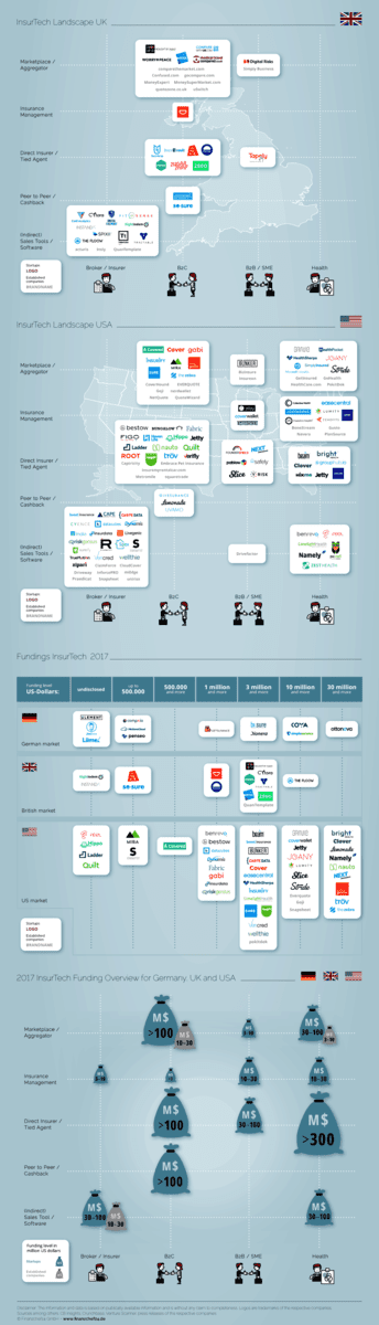 1. Marketplace/Aggregator: Vergleichsportale mit meist unterschiedlichen Produkten/unterschiedlichen Versicherern 2. Insurance Management: Versicherungsverwaltung – vom digitalen Versicherungsordner bis hin zu Verwaltungsprogrammen für Unternehmen (sogenannte „Employee Benefits“-Systeme, die auch Versicherungen enthalten) 3. Direct Insurer/Tied Agent: Direktversicherer sowie Mehrfachagenten (Vermittler, die exklusiv für einen Versicherer arbeiten) mit dem Ziel eines Online-Abschlusses 4. Peer-2-Peer/Cashback: Unternehmen sammeln Versicherungsbeiträge mit dem Ziel der (teilweisen) Rückerstattung der Beiträge (unter anderem zu karitativen Zwecken) 5. (Indirect) Sales Tools/Software: InsurTechs stellen Unternehmen, Versicherern oder Maklern Technologie zur Vermittlung oder Analyse von Versicherungsdaten zur Verfügung.