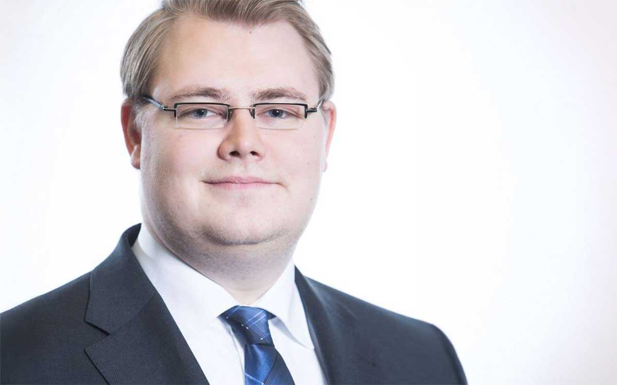 Jannik Harms, IT-Projektmanager bei Sollers Consulting, präsentiert sich in formeller Kleidung. Sein Auftreten spiegelt die Kernsystem-Strategie wider, die auf die Integration von Künstlicher Intelligenz in Versicherungs-Kernsysteme abzielt.