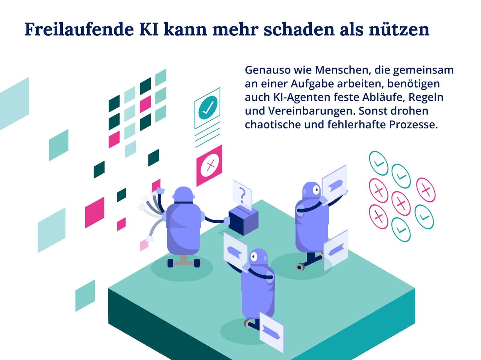 Technisch lässt sich das durch eine strikte Prozessorchestrierung mittels Case-Management-Systemen lösen. Diese bindet die KI-Agenten als ausführende Komponenten in fest definierte Workflows ein und steuert und protokolliert explizit jeden Prozessschritt.