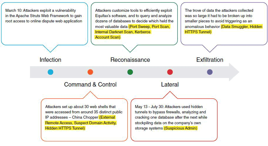 An einem durchschnittlichen Tag im Jahr 2017 erfasste das Cyber Threat Center von Equifax etwa 2,5 Milliarden Protokolle, überwachte mehr als 50.000 Sicherheitsereignisse pro Sekunde, erhielt über 43.000 Zustandsschecks für Sicherheitsgeräte, analysierte über 250 Internetdomains und befragte über 2.200 Cyber-Intelligence-Foren nach den aktuellen Bedrohungen. Trotz dieser Bemühungen blieb die verhängnisvolle Sicherheitsverletzung 78 Tage lang unentdeckt.
