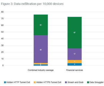 Auf jeweils 10.000 Geräten in allen Branchen wurden 11 versteckte HTTPS-Tunnel erkannt. Bei den Finanzdienstleistern war diese Zahl mit 23 mehr als doppelt so hoch. Die Zahl der versteckten HTTP-Tunnel betrug 16 gegenüber 7 pro 10.000 Geräte im Branchenschnitt. Versteckte Tunnel sind schwer zu erkennen, da die Kommunikation über Verbindungen abläuft, die normale, allgemein zulässige Protokolle verwenden. Beispielsweise kann die Kommunikation als Text in HTTP-GET-Requests sowie in Header, Cookies und andere Felder eingebettet werden. Die Anfragen und Antworten sind innerhalb des erlaubten Protokolls unter den Nachrichten versteckt.