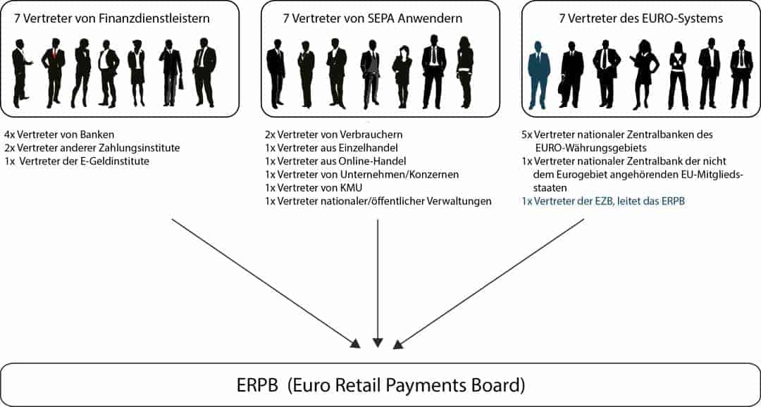 Das ERPB besteht aus sieben Vertretern von Finanzdienstleistern (vier Vertreter der Banken, zwei Vertreter anderer Zahlungsinstitute und ein Vertreter der E-Geldinstitute) und sieben Vertretern von SEPA-Anwendern (zwei Vertreter der Verbraucher und je ein Vertreter der folgenden Interessengruppen: Einzelhändler, Internethändler, Unternehmen/Konzerne, kleine/mittlere Unternehmen und nationale/öffentliche Verwaltungen) sowie rotierend sechs Vertretern nationaler Zentralbanken (fünf Vertreter der nationalen Zentralbanken des Euro-Währungsgebiets und ein Vertreter der nationalen Zentralbanken, der nicht dem Eurogebiet angehörenden EU-Mitgliedsstaaten). Das ERPB wird von einem Vertreter der Europäischen Zentralbank geleitet.
