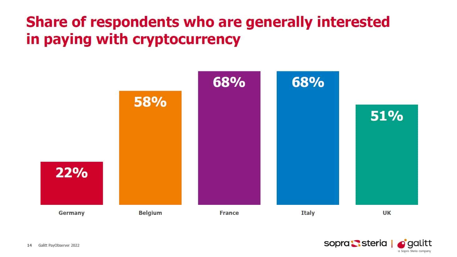 Während sich in Deutschland nur 22 Prozent vorstellen können, mit Kryptowährungen zu bezahlen, ist das Interesse in anderen Ländern weitaus höher. In Italien und Frankreich sind sogar 68% daran interessiert, mit Kryptogeld zu bezahlen.