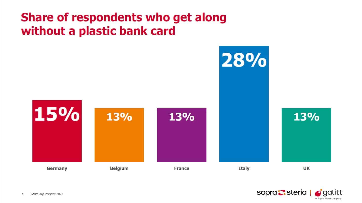 In Italien hängen zudem weniger Menschen am Plastikgeld als in den anderen untersuchten Ländern: 28 Prozent würden mit dem Smartphone bezahlen, wenn die Karten aus dem Verkehr gezogen würden. Absolute Mobile-Payment-Verweigerer gibt es in Italien kaum. In den drei weiteren untersuchten Ländern hängen die Menschen ähnlich stark an der Bankkarte wie in Deutschland.