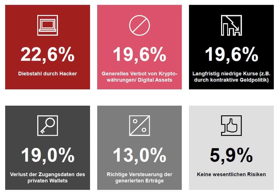 Als größtes Risiko bei Kryptowährungen und Digital Assets fürchten die deutschen Investoren den Diebstahl durch Hacking (23%). Daher steht für 39% der Befragten die Vertrauenswürdigkeit und Sicherheit der Handelsplattform an erster Stelle, während niedrige Kosten (15%) und die Auswahl der handelbaren Kryptowährungen (13%) nur nachgelagerte Kriterien bei der Entscheidung für Handelsplattformen sind. Auch ein generelles Verbot von Kryptowährungen, der Verlust der Zugangsdaten und steuerliche Aspekte werden als mögliche Risiken angesehen.