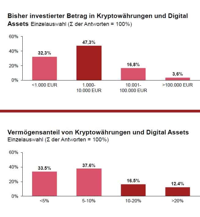 Die Deutschen investieren am häufigsten in Bitcoin (79%), Ethereum (58%) sowie Litecoin und Dogecoin (jeweils 31%). Zudem haben 24% einen Teil ihres Vermögens bereits in NFTs angelegt. Deutsche Kryptoinvestoren sind von der langfristigen Zukunftsperspektive der Assetklasse überzeugt: Trotz der jüngsten Einbrüche des Kryptomarktes seit November 2021 folgen 41% der befragten Privatanleger der Prämisse „Hold on for dear life“ (HODL) und haben ihre Positionen während des Crashs nicht verändert – rund ein Viertel hat hingegen entweder die Positionen erhöht oder zunächst verkauft, um dann zu günstigeren Kursen wieder einzusteigen.