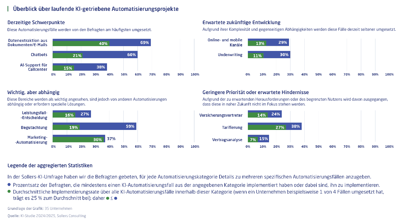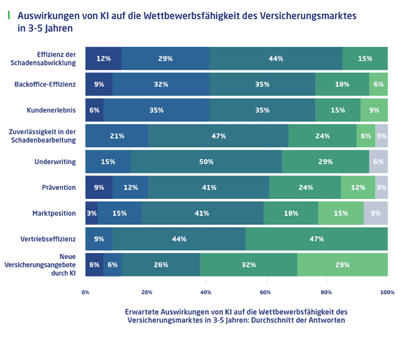 KI wird vor allem zur Automatisierung der Datenerfassung, der Dokumentenverarbeitung und von Teilen des Schadenbearbeitungsprozesses eingesetzt. In den nächsten drei Jahren werden wir jedoch eine dramatische Ausweitung auf Underwriting-Prozesse, Tarifierung und kundenorientierte Bereiche wie Produktangebote und digitale Dienstleistungen erleben.