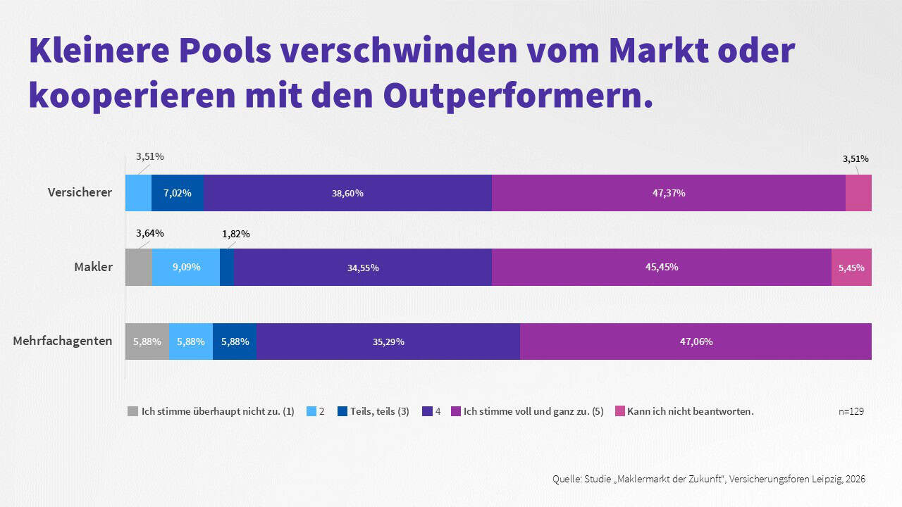 Im Segment der Maklerpools herrscht ein starker Konsens (über 80 %) über eine bevorstehende Konsolidierungswelle. Es wird erwartet, dass kleine Pools vom Markt verschwinden und deren angebundene Vermittler zu den Marktführern migrieren. Zudem rechnen über 80 Prozent der befragten Versicherer damit, dass sich erfolgreiche Pools durch Zukäufe verstärkt zu Maklergruppen weiterentwickeln.