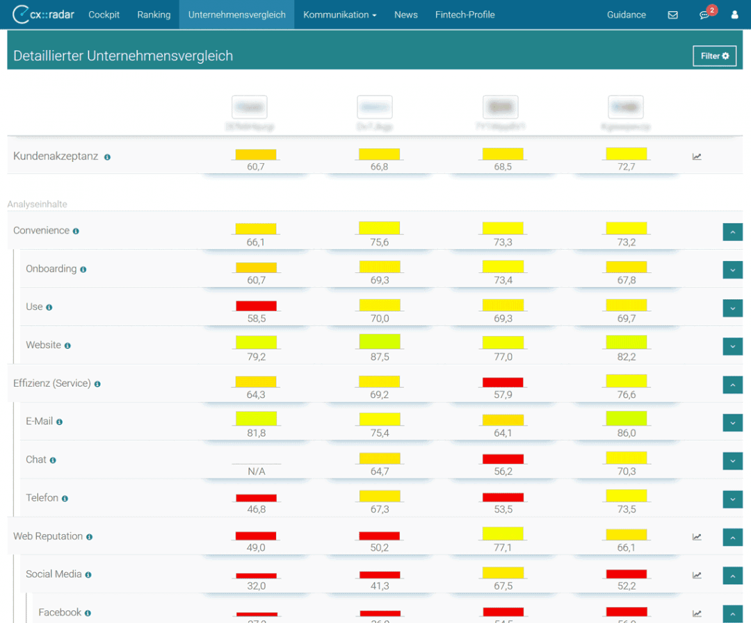 1. Das Cockpit: liefere aktuelle FinTech-News, einen Überblick über die Kundenakzeptanz der einzelnen Unternehmen – sortiert und gerankt nach Funktionsbereich und Touchpoint. 2. Rankings: Anzeige der Ergebnisse der Analyse sowohl als Komplettübersicht als auch aus diversen Perspektiven und mit zahlreichen zusätzlichen Detailstufen und nach Bedarf filterbar. 3. Unternehmensvergleich: Nutzer wählen hier aus, welche Unternehmen sie hinsichtlich ihrer Kundenakzeptanz untereinander vergleichen möchten. Zusätzliche Detailstufen aller Analyseinhalte seien hier ebenfalls ein- und ausblendbar. 4. News: Nachrichten aus dem FinTech-Sektor. 5. Fintech-Profile: Im ‘cx::radar’ würde jedes FinTech mit allen Untersuchungsergebnissen vorgestellt und eine transparente Dokumentation der Analyseinhalte fasse die wichtigsten Informationen wie aktuelle Services, Produkte und Preise zusammen.