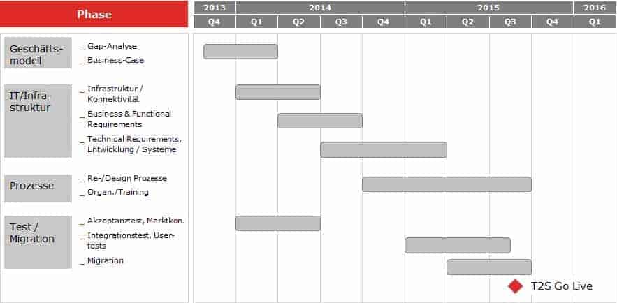 T2S soll als „Single Settlement Engine for Europe“ die Harmonisierung von bestehenden Infrastrukturen und gelebten Marktpraktiken vorantreiben. Für die Marktteilnehmer hat dies Folgen: die grenzüberschreitende Standardisierung bringt neue Anforderungen mit sich – etwa an das Message System (SWIFT oder SIA & Colt), die Settlementzeiten (außerhalb von Deutschland gilt häufig T+3), die Übertragung von Sicherheiten sowie die Form der technischen Anbindungen an die T2S-Platform.