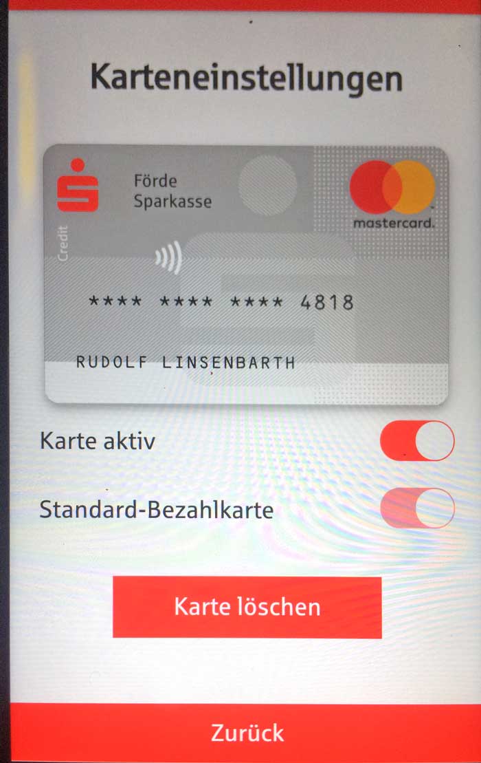 Nach erfolgreicher Karteninstallation kann das umgehend wieder abgeschaltet werden, das Bezahlen funktioniert dann auch ohne Smartphone-Ortung. Beide Kartenprodukte sind sofort einsatzfähig. Im Gegensatz zur genossenschaftlichen Lösung ist hier auch die girocard ein digitaler Zwilling. Das heißt, Plastikkarte und Smartphone haben dieselbe PIN, denselben Verfügungsrahmen und teilen sich den Fehlbedienungszähler für die PIN-Eingabe.