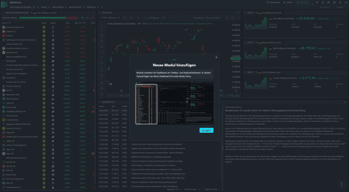 . Mit interaktiven Tutorials in MyMarkets 1.8 will FDC brokeredge ihre Trading Plattform nutzerfreundlicher und zugänglicher machen. Die integrierten Schritt für Schritt Anleitungen sollen Nutzern den Einstieg in das Analyse- und Trading System einfacher machen und ihnen helfen, individuelle Dashboards modular zu gestalten. So könnten Kunden die Funktionen der Plattform besser verstehen, was Einstiegshürden reduziere. Über ein Overlay könnten sich Nutzer Schritt für Schritt mit unterschiedlichen Tools und Funktionen von MyMarkets vertraut machen, um das Maximum aus der Plattform herauszuholen. Zu Beginn stünden die Tutorials „Dashboards erstellen“ und „Modul hinzufügen“ zur Verfügung. Diese würden dann kontinuierlich erweitert, um auch weitere Module und Funktionen zu erläutern.Wir entwickeln MyMarkets, um Anlegern nicht nur die bestmögliche Trading Umgebung zu bieten, sondern echte Handlungsmacht über ihre datengetriebenen Entscheidungen. Nutzer können schnell und einfach lernen, wie sie ihre eigenen Markt- und Trading Ansichten so gestalten, wie sie es wünschen, nicht so, wie eine Plattform es ihnen vorgibt.“sagt Mario Winkler, Manager bei FDC brokeredge.. MyMarkets will Analyse und Trading in einer Benutzeroberfläche verbinden und Anlegern einen kohärenten Blick auf ihre Finanzentscheidungen bieten ohne den Bedarf nach verschiedenen Tools und Plattformen. Die zusätzliche Möglichkeit, Dashboards über einen Ka I Chat in Echtzeit zu konfigurieren und anzupassen, sorge für einen schnelleren Einstieg und einen effizientere Workflows, unabhängig vom individuellen Erfahrungsniveau.