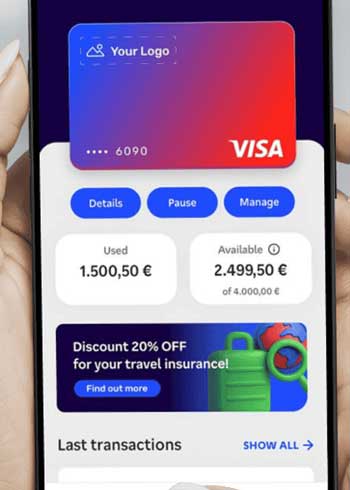 Eine mobile Anwendung zeigt eine digitale Kreditkarte mit dem Logo von Nexi. Die Benutzeroberfläche präsentiert Informationen zu verfügbaren und genutzten Beträgen sowie aktuelle Transaktionen. Zudem wird ein Rabattangebot für Reiseversicherungen hervorgehoben.