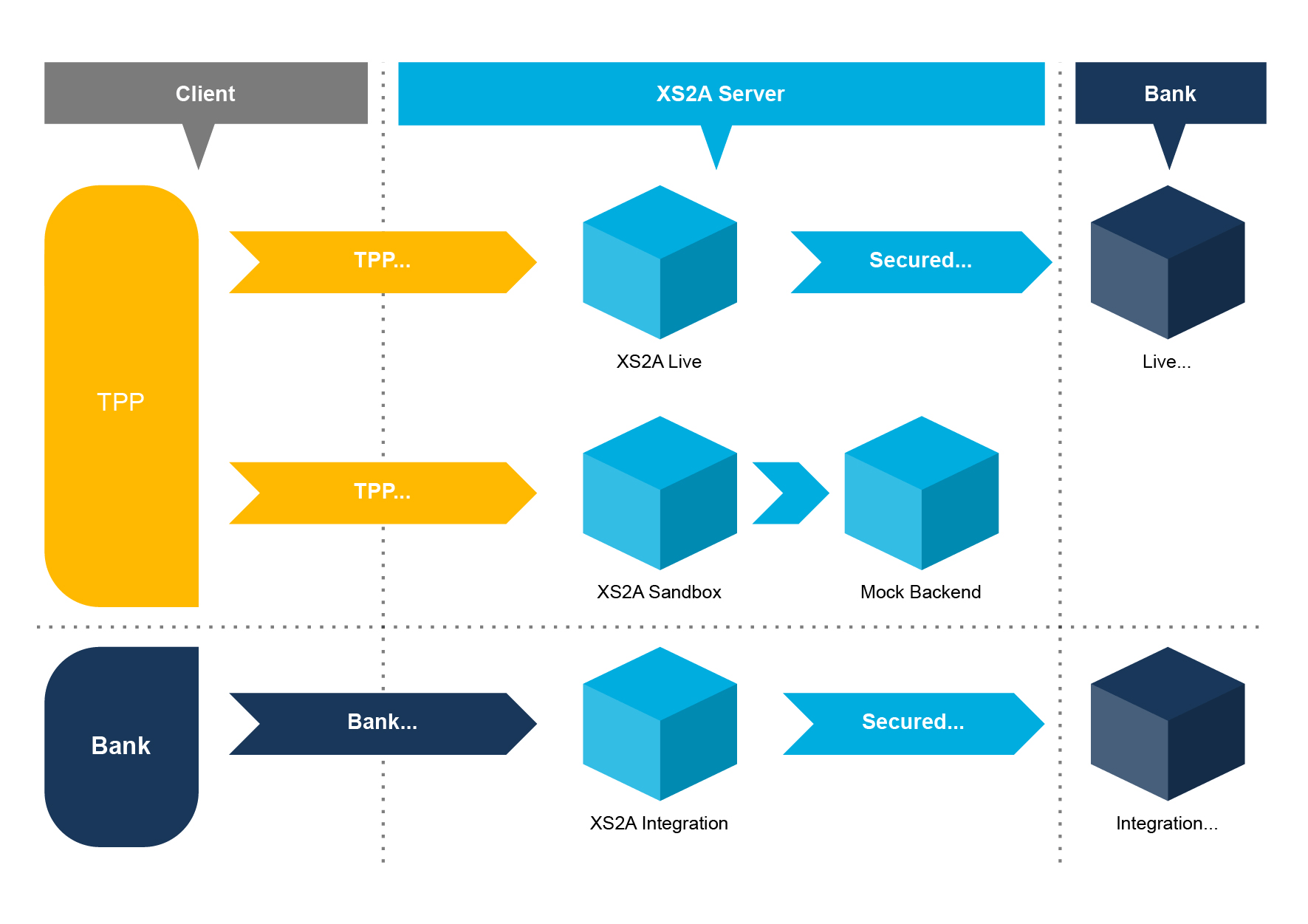 Die Abbildung illustriert die Architektur eines XS2A-Servers, der die Interaktion zwischen Clients, regulierten Drittanbietern (TPP) und Banken ermöglicht. Sie zeigt verschiedene Komponenten wie XS2A Live, XS2A Sandbox und Integrationsmöglichkeiten.