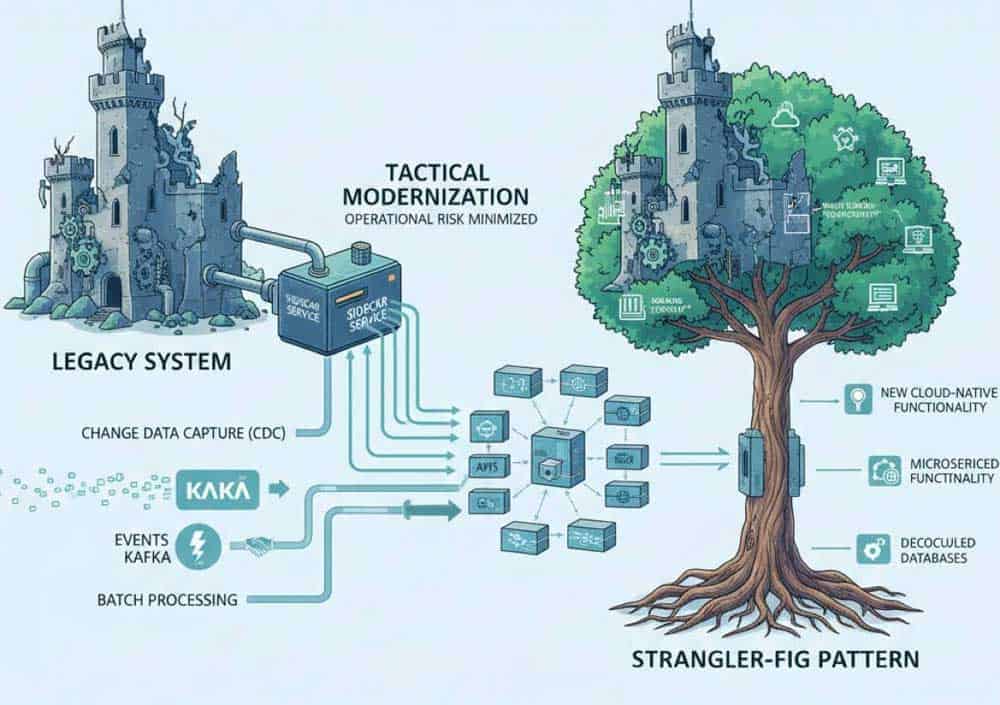 Während für die Echtzeit-Synchronisation Change Data Capture (CDC) bevorzugt wird, ergänzen minimale Core-Erweiterungen und Middleware wie Kafka das Vorgehen. Eine Kombination aus CDC, Events, APIs und Batch-Verfahren minimiert laut den Experten das operative Risiko. Dieser Ansatz dient als Basis für das Strangler-Fig-Pattern, um Funktionalitäten sukzessive auf moderne Cloud-Strukturen zu übertragen.