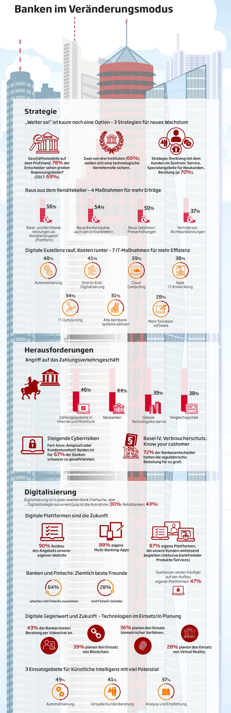 Im Frühjahr 2018 führte das Marktforschungsinstitut Research Now im Auftrag von Sopra Steria Consulting und dem F.A.Z-Institut eine Befragung von 109 Fach- und Führungskräften von Banken mit Bilanzsummen über 500 Millionen Euro durch. Als Befragungsmethode wurde CAWI (Computer Assisted Web Interviewing) eingesetzt. Teil der Studienergebnisse sind zudem vier vertiefende Interviews mit Entscheidern aus Banken und Sparkassen, dazugehörigen IT-Unternehmen sowie mit Stefan Lamprecht, Mitglied der Geschäftsleitung von Sopra Steria Consulting, über Einschätzungen und Standpunkte zur Lage und Zukunft der Bankenbranche.