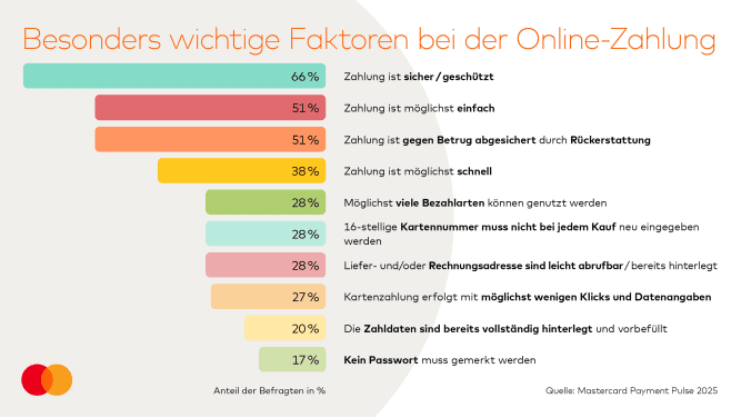 Beim Online-Bezahlen steht aus Sicht der Verbraucher weiterhin die Sicherheit im Vordergrund. Zwei Drittel der Befragten (66 Prozent) nennen ein hohes Sicherheitsniveau als wichtigste Anforderung an digitale Bezahlprozesse. Darüber hinaus spielen Aspekte der Nutzerfreundlichkeit eine zentrale Rolle. Mehr als die Hälfte der Teilnehmer (51 Prozent) erwartet eine möglichst einfache Abwicklung des Zahlungsvorgangs, während 38 Prozent großen Wert auf eine schnelle Transaktionsabwicklung legen.