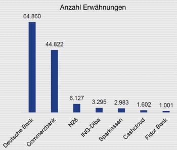 Im Schnitt sind die alteingesessenen Geldhäuser in der Web-Öffentlichkeit also deutlich präsenter als ihre Cyber-Konkurrenz. Doch nicht jede Bank und jedes FinTech-Unternehmen sind durchschnittlich. Im Detail zeigt sich: Die meisten Nennungen der etablierten Kreditinstitute entfallen auf die zwei größten untersuchten Banken – die Deutsche Bank mit 64.860 und die Commerzbank mit 44.822 Erwähnungen.