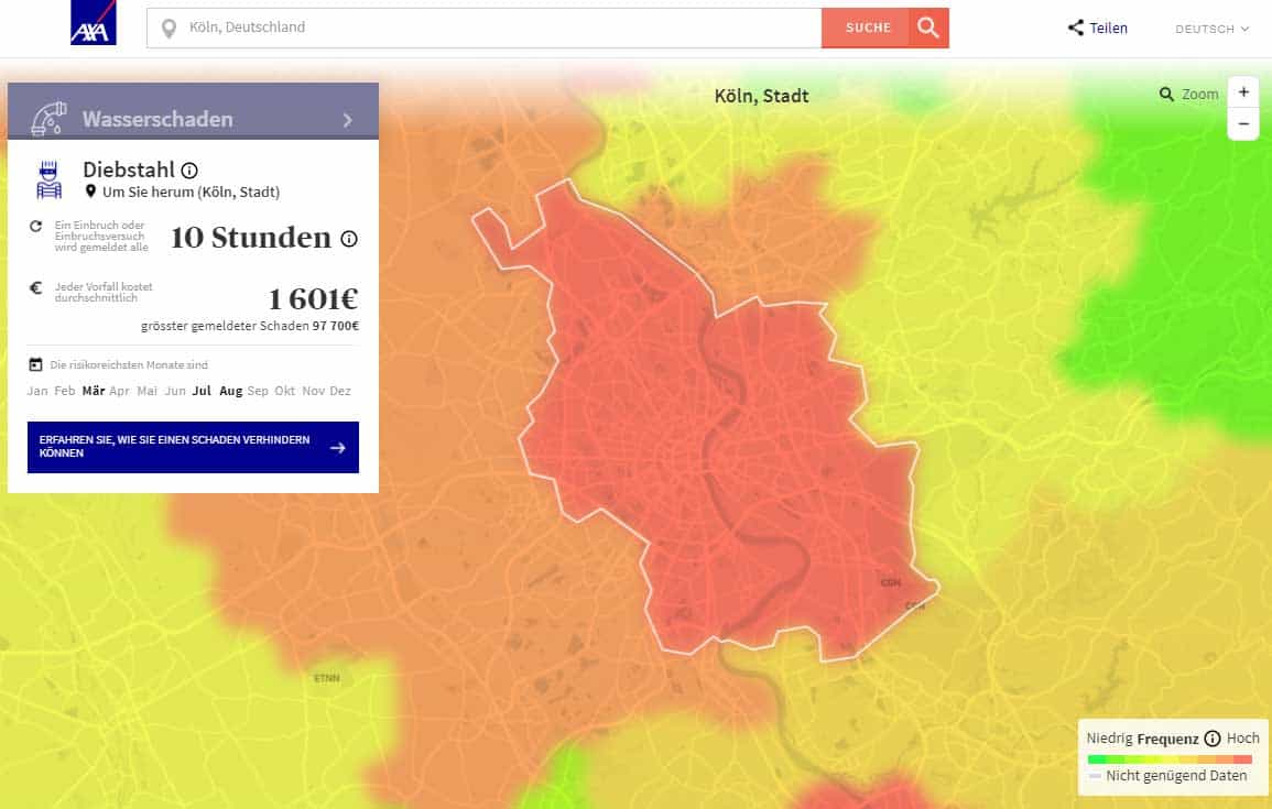givedataback.axa ist für jeden frei zugänglich. In der Suchleiste können die Nutzer ein Land, eine Stadt oder eine individuelle Adresse eintragen, woraufhin die entsprechenden Daten angezeigt werden. In der Colonia-Allee in Köln, dem Sitz der DeutschlandZentrale von AXA, kostet jeder Einbruchschaden im Durchschnitt 1.665 Euro, die meisten Schäden treten in den Monaten Januar, März und September auf.