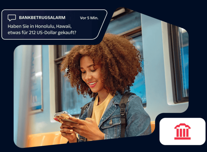Eine Person mit lockigem Haar nutzt ein Smartphone in einem öffentlichen Verkehrsmittel. Auf dem Bildschirm erscheint eine Nachricht über einen möglichen Betrugsalarm. Twilio wird als Technologie hervorgehoben, die Banken bei der Kundenkommunikation unterstützt.