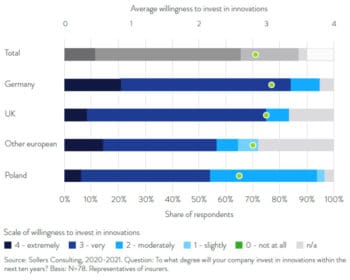 Grundsätzlich offenbaren die Versicherer eine hohe Investitionsbereitschaft, doch es gibt regionale Unterschiede. So zeigt sich in Deutschland eine größere Neigung, neue Technologien einzuführen als beispielsweise in Polen. Die Berater von Sollers nennen dafür zwei unterschiedliche Gründe: Zum einen gebe es Differenzen im Grad der Digitalisierung der jeweiligen Märkte. Zum anderen sei auch das Bewusstsein für deren disruptive Kraft unterschiedlich stark ausgeprägt, so Marcin Pluta, Managing Partner und Mitbegründer von Sollers Consulting.