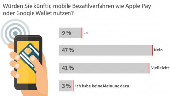 Offener zeigen sich die Befragten allerdings, wenn es um konkrete Dienste der angesprochenen Unternehmen geht wie bspw. Google Wallet oder ApplePay. Hier könnten sich zumindest 41 % vorstellen, ein solches mobiles Bezahlsystem zu nutzen, 9 % würden dies ganz sicher tun, 47 % wollen diese Dienste künftig nicht nutzen.