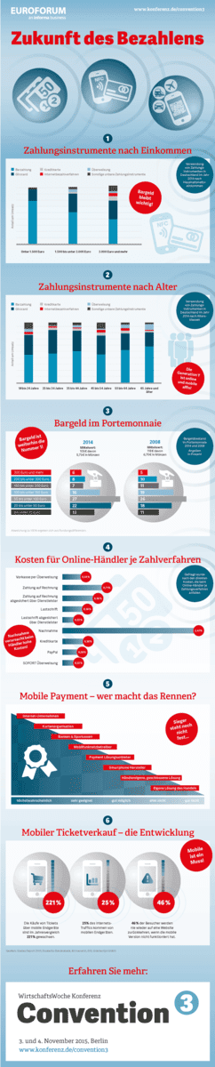 Die WirtschaftsWoche Konferenz Convention³ (3. und 4. November 2015, Berlin) will erstmals drei Konferenzen zu den Themen Bargeldlogistik , Mobile Payment und Mobile Ticketing unter einem Dach vereinen. Die Teilnehmer des Kongresses können die drängenden Probleme rund um bare und unbare Bezahlverfahren mit Experten aus Banken, Handel, Dienstleistern, Aufsicht und Sicherheit diskutieren und gemeinsam kundenorientierte Lösungen entwickeln.